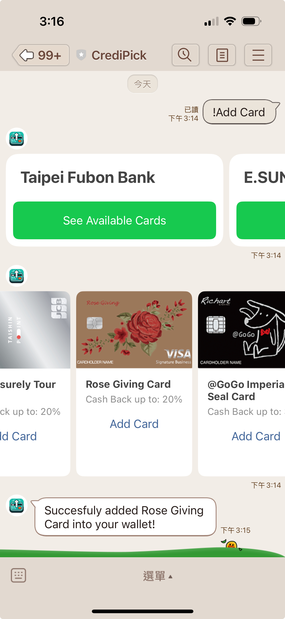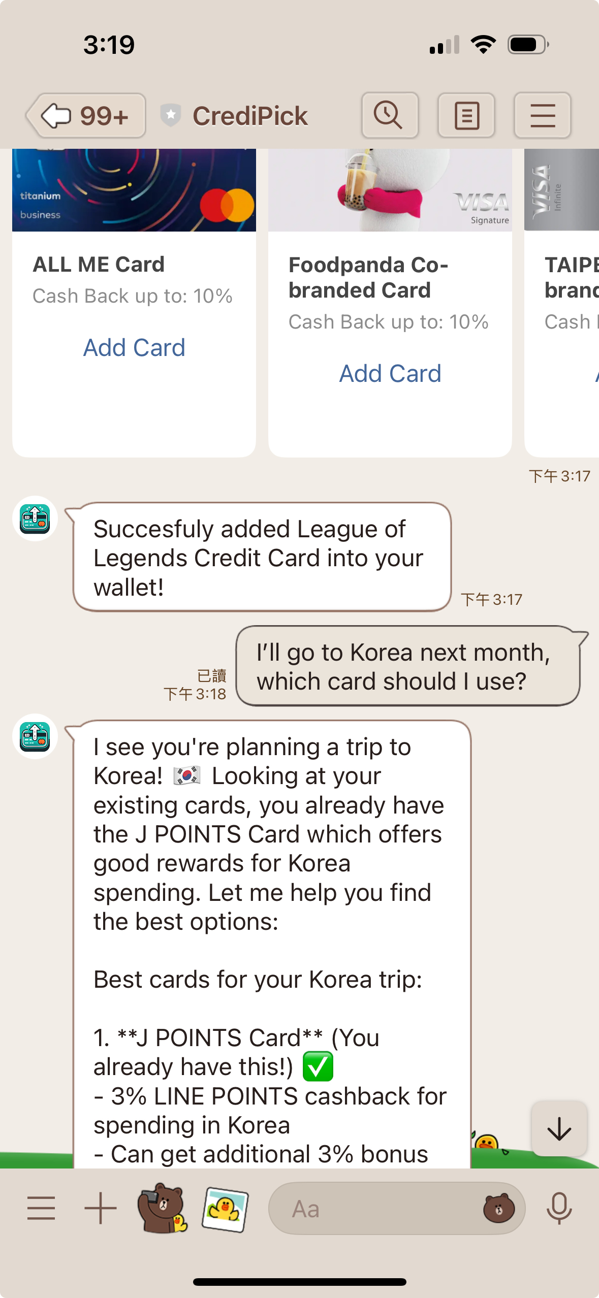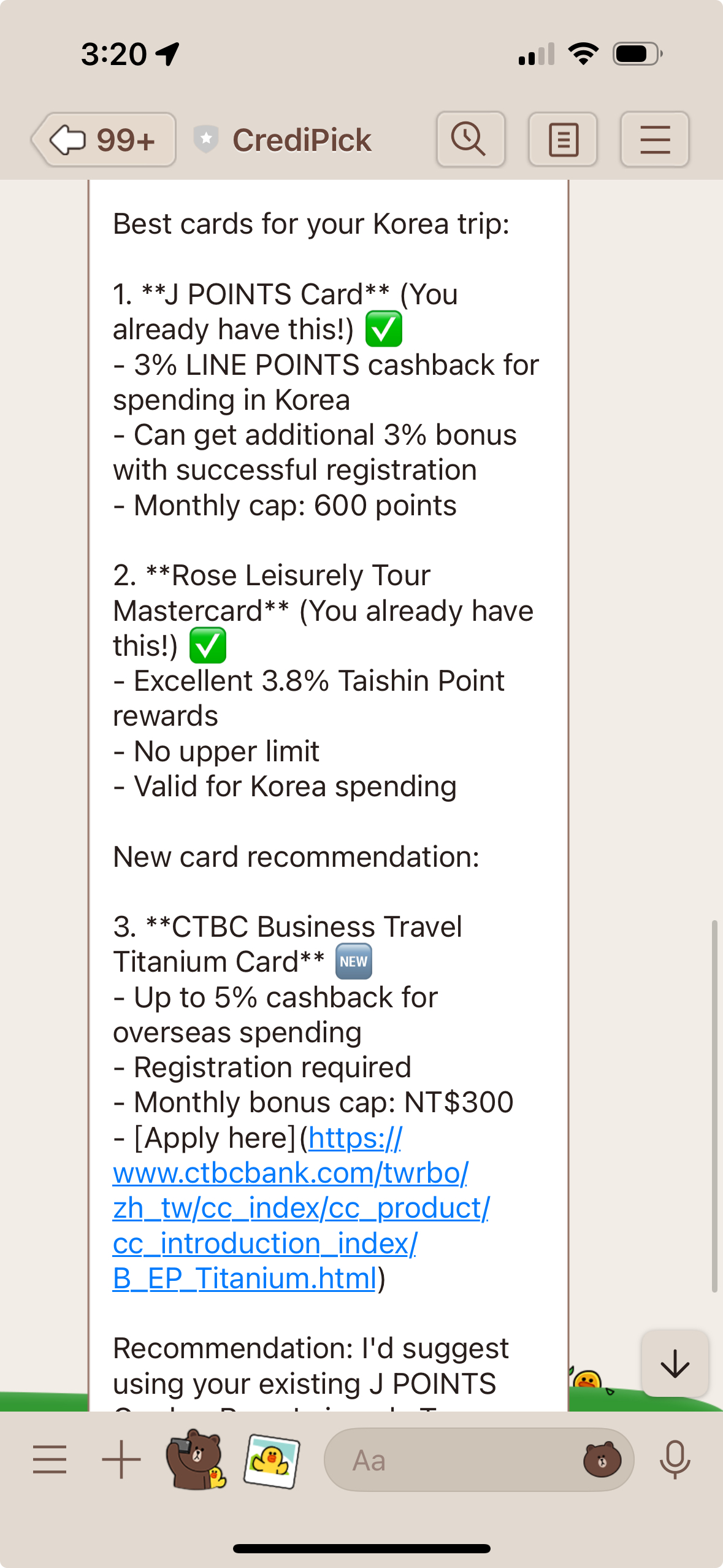 Get the best rewards from your credit cards effortlessly. Our LineBot and Chrome Extension recommend the top cards for every purchase. Save more, stress less!